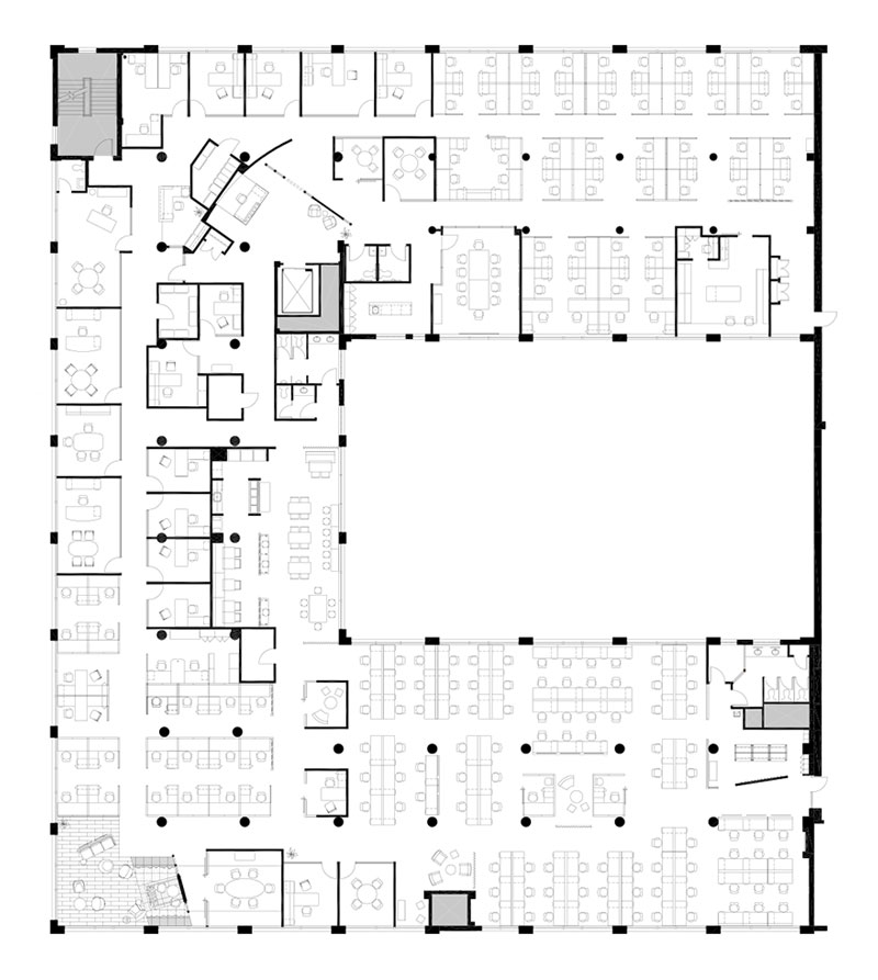 The space is surrounded by windows on three full sides, including interior windows that overlook a covered atrium. The u-shaped floor plan created a challenging floor plate. Key shared areas such as an open plaza in the middle of the floor plan and an open lounge in the most desirable corner of the office were included purposefully in the design to unite the divided space, providing a gathering place for breaks, coffee and casual meetings.