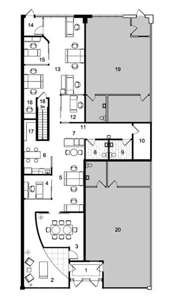 We were retained to develop the overall interior design scheme, space plans, construction details, interior finishes and furniture layout. The space plan was developed to provide a plan for expansion into the South West corner of the building.