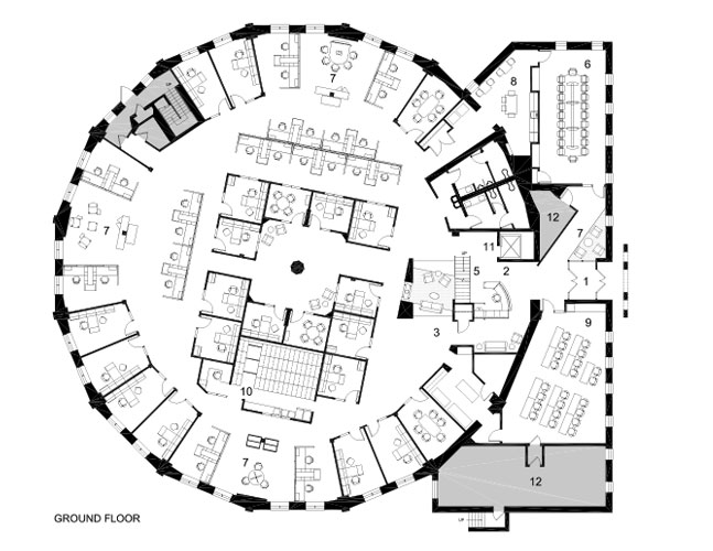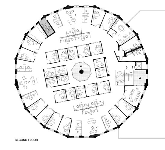 The historic Cyclorama Building was renovated for the new offices of Lumsden McCormick, LLP accounting firm. The shape of the building created an interesting challenge to provide the required number of offices while allowing natural light to penetrate to the building interior. The center atrium provided interesting pathways through the center of the building.