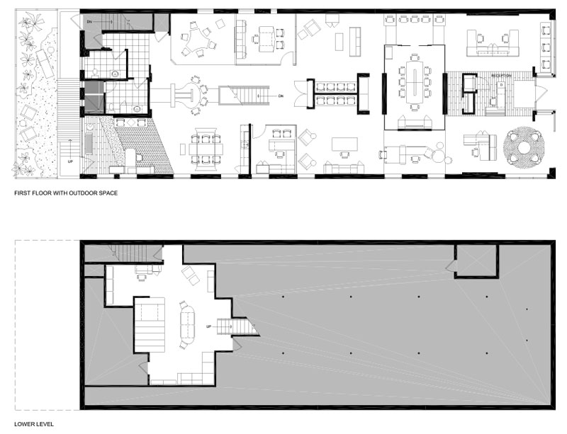 The original building layout was redesigned from a shared center entrance for two existing tenants to a single tenant occupancy. All new interior building materials were carefully selected, including toilet room finishes and new lighting throughout. The property included a quaint courtyard space at the rear of the building that we opened up by installing a large storefront with an access door, exposing the outdoor space and filling the showroom with natural light. This allowed the owner an opportunity to display outdoor furnishings, as well as have a unique event space. The lower level was designed as an extension of the upper floor. It now provides a warm and inviting gathering area to review materials and finish selections.